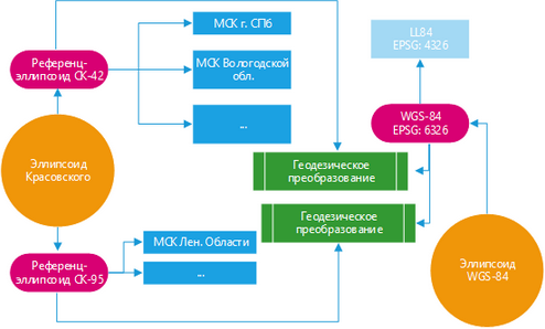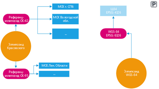Наша логика действия такая, чтобы удостовериться, что для родительского референц-эллипсоида СК для СПб было бы какое-либо геодезическое преобразование, которое связывало бы данный референц-эллипсоид и референц-эллипсоид конечной системы (LL84). Тогда данные смогут быть преобразованы.