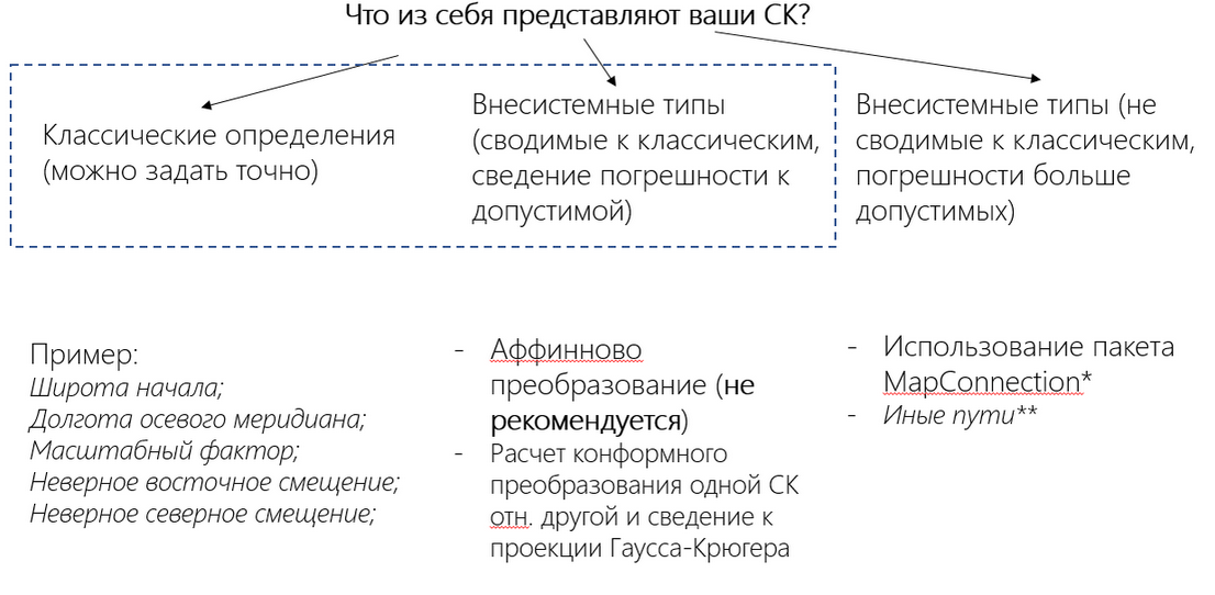 Следующий путь (наиболее вероятный), что систему координат потребуется посчитать вручную по набору опорных точек. Здесь есть как минимум 2 метода - аффинново преобразование (тип проекции “Поперечная Меркатора с последующей аффинновой переработкой”) и конформное преобразование с получением описания проекции “Гаусса-Крюгера”. Здесь мы берем координаты точек/пунктов в другой системе координат и относительно неё (этой второй СК) формируем описание новой СК (это мы детально рассмотрим в следующих частях цикла статей).