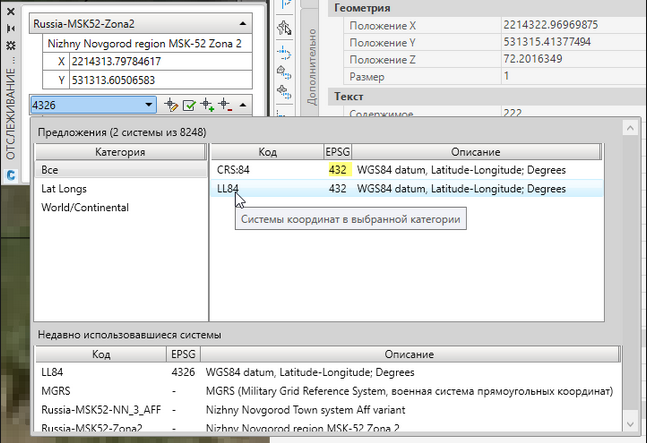 Видите, да? Отображаемые координаты не совпадают с LL84, а совпадают с так называемой LL (EPSG:4030)