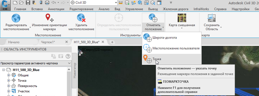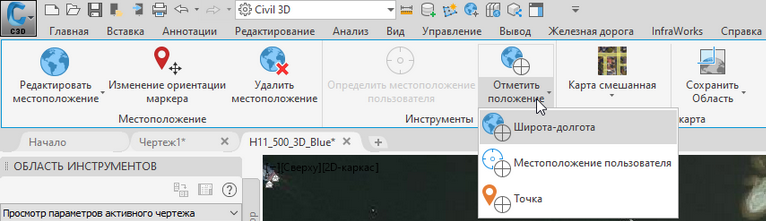 При условии назначенной чертежу системы координат, на активной вкладке “Геопозиционирование” у нас есть ряд опций, среди которых следующие: