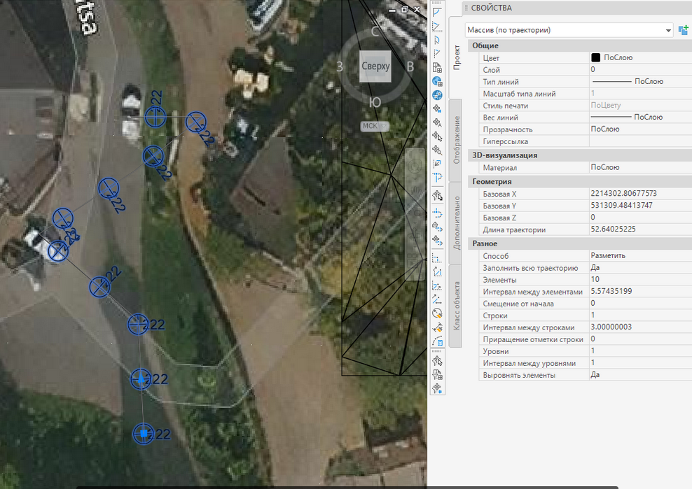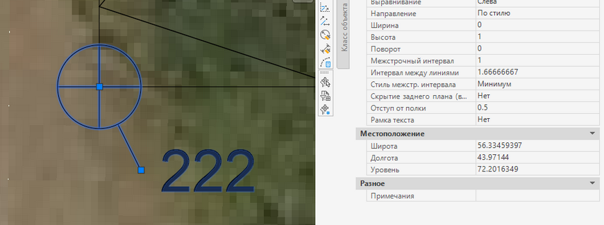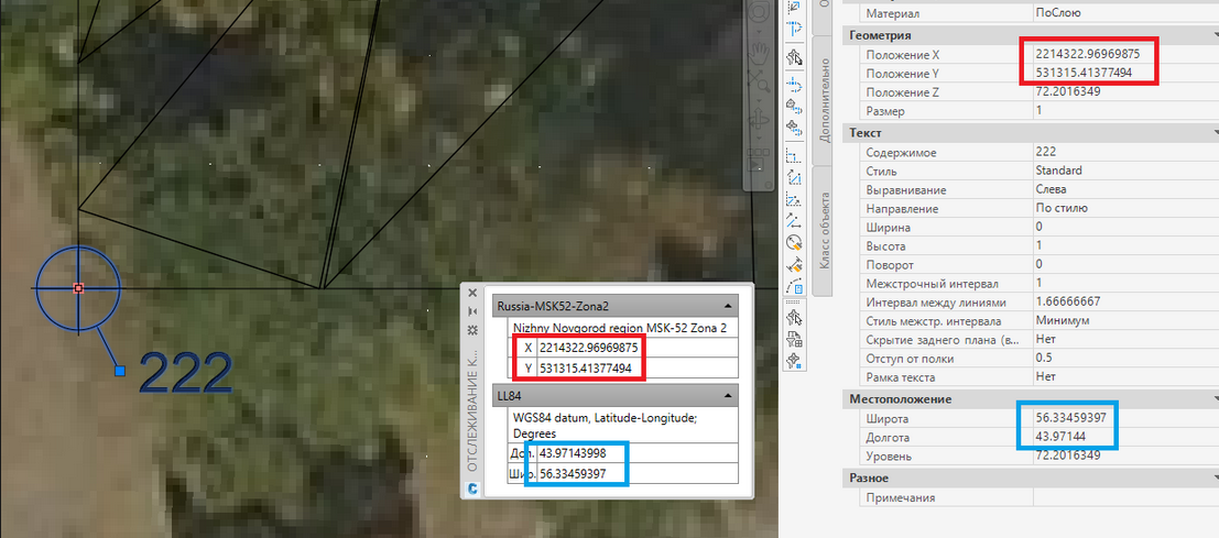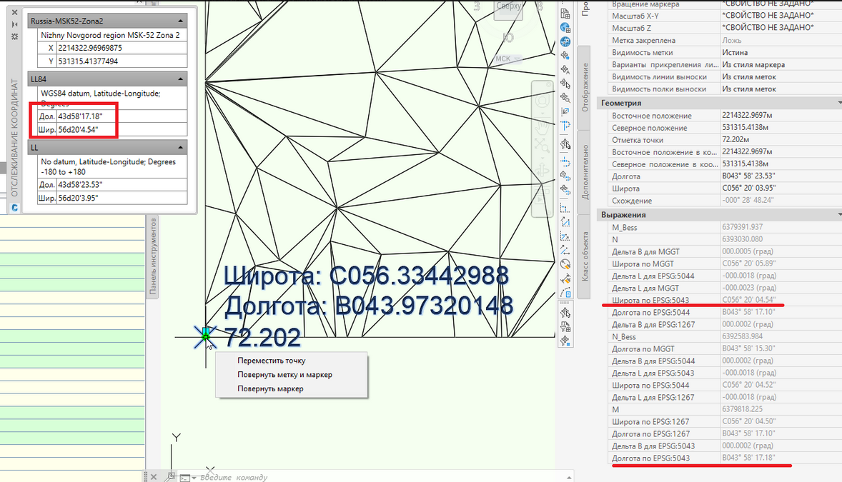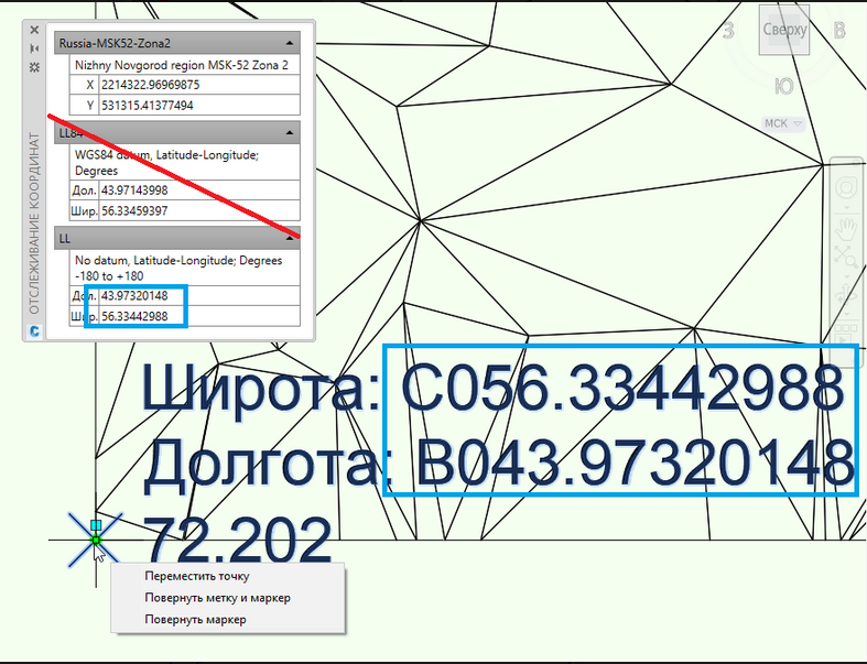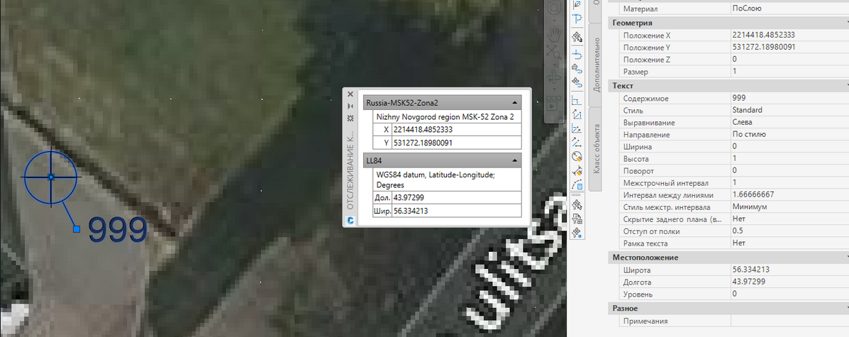 Переходим к следующему интересному функционалу, а именно свойствам COGO точек. При назначении чертежу системы координат, у них активируется пара свойств - “Широта” и “Долгота”. Вынесем эти свойства в метку и для проверки активируем инструмент отслеживания координат MAPTRACKSCS: