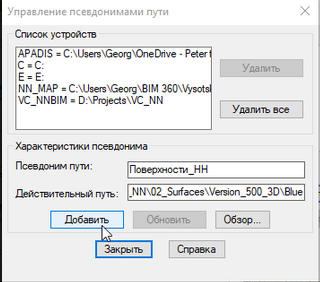 В строку “Псевдоним пути” введем условное наименование, в строку “Действительный путь” - скопированный полный путь к каталогу с данными. После этого нажмем на “Добавить”