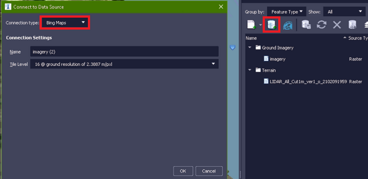 Предположим, что мы создали пользовательскую модель способом выше и хотим загрузить поверх неё растровый спутниковый снимок. Стандартный функционал InfraWorks предоставляет такую возможность из панели “Источники данных” запускаем менеджер поделючения к базам данных (см. картинку ниже), выбираем пункт “Карты Bing”, необходимое разрешение и обновляем данный источник данных для старта загрузки изображения